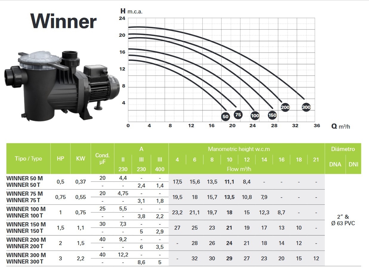 Samonasávacie filtračné čerpadlo SACI Winner 150 M (230 V) je robustný jednofázový model s mimoriadne vysokým prietokom 21 m3/h, ideálny pre filtráciu veľkých súkromných bazénov (až do 100 m3). Vyznačuje sa tichou, energeticky úspornou prevádzkou a extrémnou odolnosťou voči slanej a morskej vode vďaka hriadeľu z nerezovej ocele AISI 316, čo zaručuje dlhú životnosť.