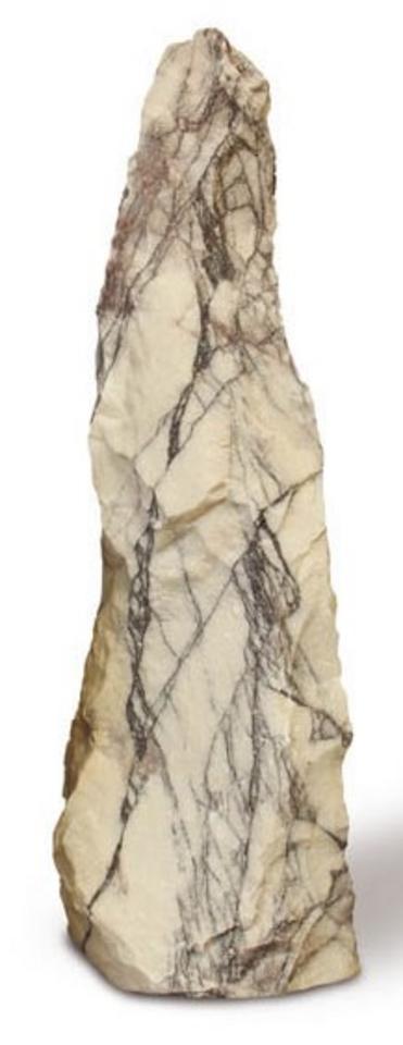 Stĺp Leilac je robustný monolit, ktorého základom je čistý biely mramor pretkaný jemnými, no hlbokými fialovými žilami. Tento kontrast vytvára jemný, chladný "lilac" odtieň v okolitom kameni, čo robí zo stĺpa mimoriadne pútavý a jedinečný prvok. Neleštený, štiepaný povrch zdôrazňuje surovú, prírodnú textúru kameňa a jeho odolnosť.