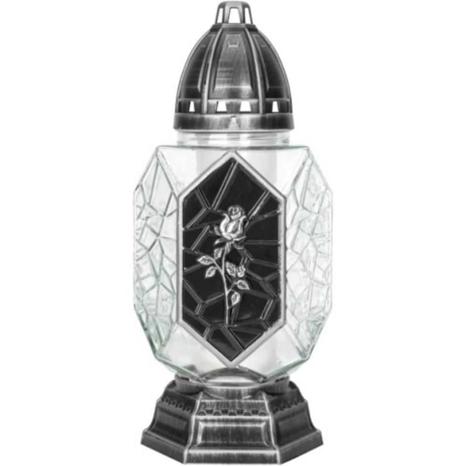 Sklenené náhrobné svetlo s vymeniteľnou náplňou s plastovým vekom a základňou. Obsahuje vložku s približnou dĺžkou horenia 48 hodín.